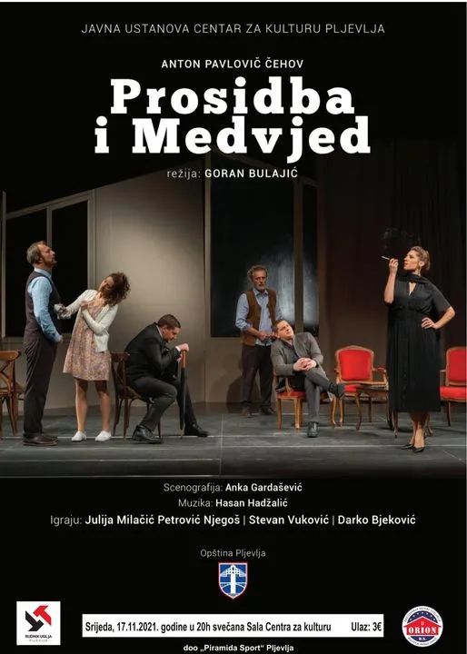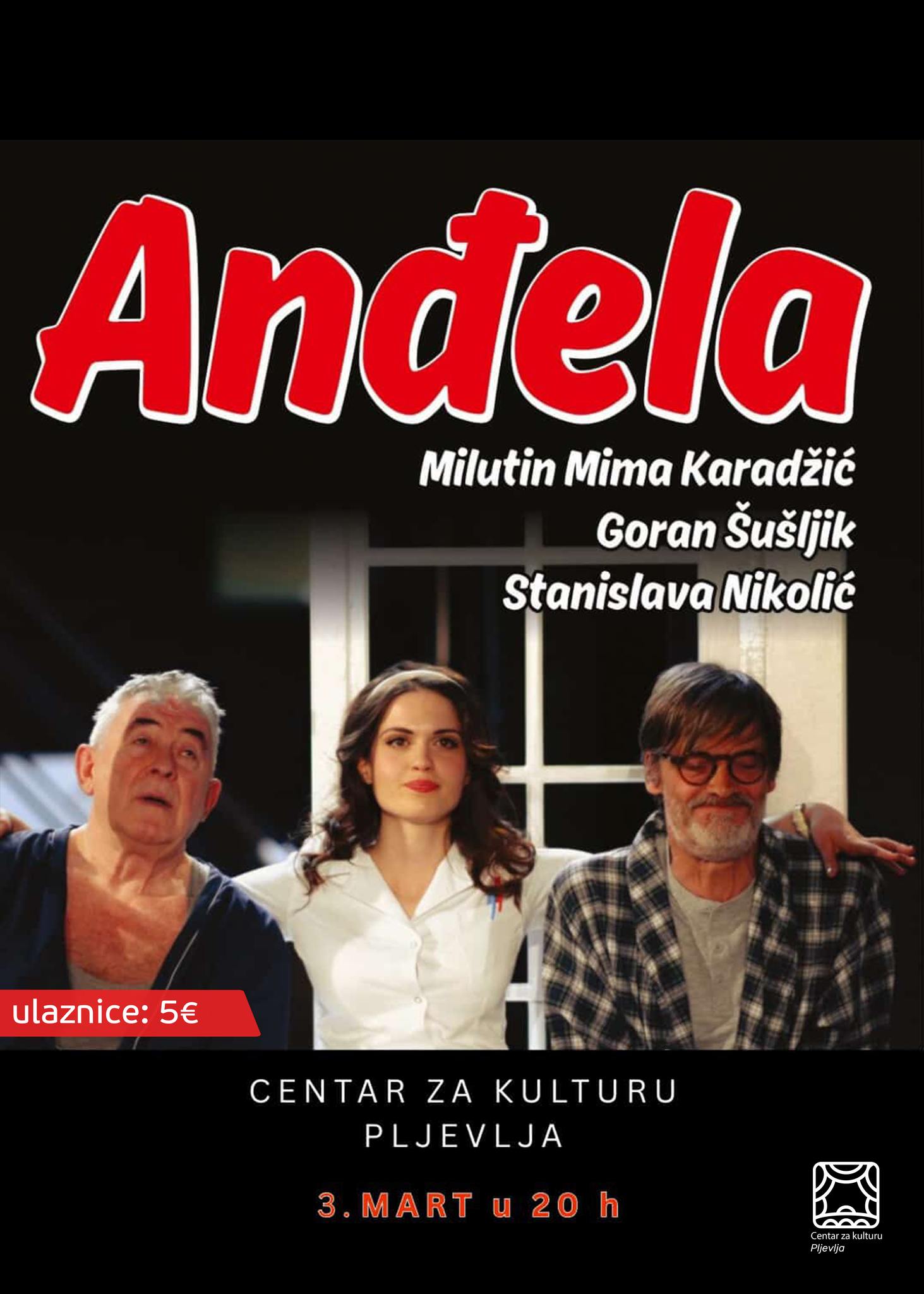 У уторак, 3. марта, са почетком од 20ч, на Великој сцени Центра за културу Пљевља, биће одиграна позоришна представа „Анђела“. Редитељ: Милан Караџић У представи играју: Милутин Мима Караџић, Горан Шушљик, Сташа Николић „Представа...