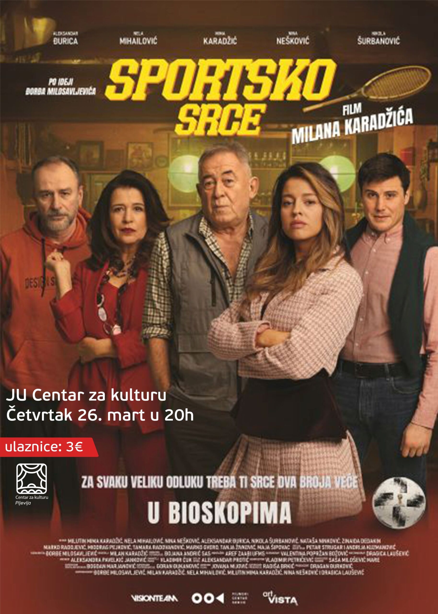 Филм “Спортско срце” (12+), емотивна комедија о судару два неспојива свијета са Мимом Караџићем и Нелом Михајловић у главним улогама, наћи ће се на репертоару Центра за културу Пљевља, у четвртак 26. марта. Пројекција...